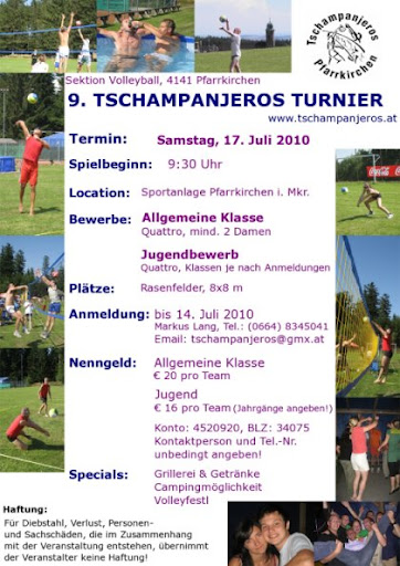 Volleyballturnier der Tschampanjeros. Es warten wieder jede Menge Specials auf euch, die Red Bull Girls sind schon heiß auf tolle Spiele! Am Abend gibt´s natürlich wieder das Volley-Festl. Als besonderen Highlight gibt´s auf der soeben neu errichteten Beach-Flutlichtanlage unvergessliche Ballkontakte unter freiem Sternenhimmel bis tief in die Nacht hinein.