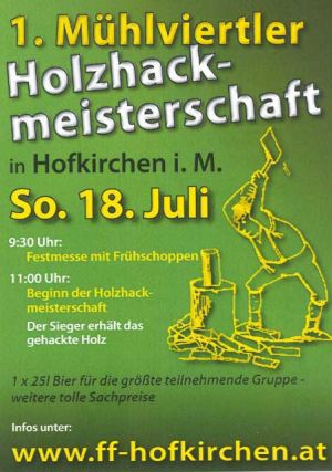 1. Mühlviertler Holzhackermeisterschaft: Mit einer Neuigkeit warten die Kameraden der FF Hofkirchen heuer beim Frühschoppen auf. Zum ersten Mal wird eine Holzhackermeisterschaft durchgeführt. Jeder kann mitmachen. In zwei Minuten sind so viele Holzscheiter wie möglich zu hacken. Der Teilnehmer mit den meisten gehackten Holzscheitern ist Sieger und erhält das an diesem Tag gesamte gehackte Holz. Weiters warten schöne Preise und ein