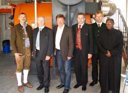 vlnr: Biomasseverbandsobmann Ludwig Schurm, Obmann Alois Perr, Landesrat Rudi Anschober, LAbg. Georg Ecker, Bürgermeister Karl Kapfer und Pfarrer Kiadi Nkambu