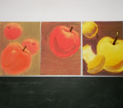 Zu sehen sind u. a. großformatige Landschaftsmalereien des Künstlers sowie die 18 Schülerarbeiten zum Thema „Apfel“. Thomas Paster zeigte den Schülern einige seiner realistischen Illustrationen, um sie für ihre eigene Arbeit zu motivieren.