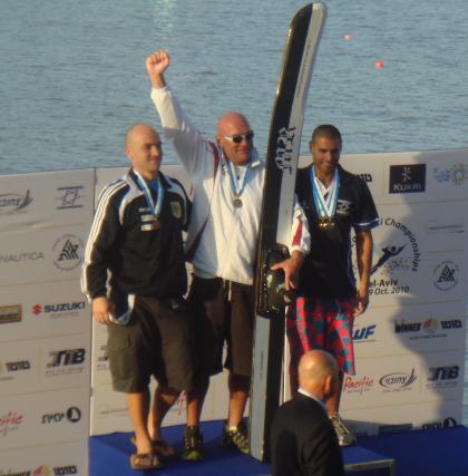 Manfred Hintringer (mitte) bejubelt seine Goldmedaille bei der Cableski-Weltmeisterschaft in Tel Aviv, Israel