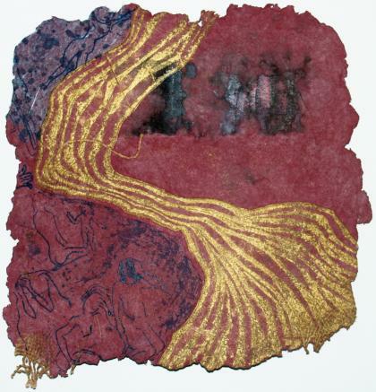 mit selbst geschöpftem Papier verbindet. In die Schichten des Papiers werden verschiedene