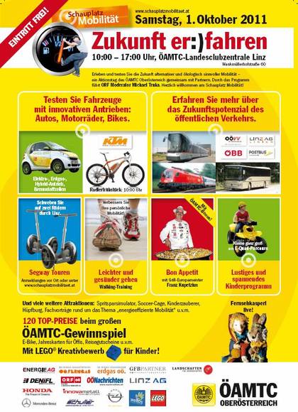 Familienprogramm: Testen Sie Ihr Einsparungspotenzial beim Kraftstoffverbrauch am Spritsparsimulator. Am Schauplatz Mobilität können ÖAMTC-Mitglieder Segways für nur 16 Euro (Nichtmiglieder 19 Euro) testen. In der Zeit von 10 Uhr bis 16 Uhr finden zu jeder vollen Stunde geführten Segway-Touren statt. Eine Tour dauert samt Einschulung rund 45 Minuten. Erschweben Sie die nähere Umgebung des Linzer Stadtteils Bindermichl. Beim ECO-Training begleitet Sie Ihr persönlicher ECO-Trainer am Schauplatz Mobilität auf einer kurzen Fahrt mit Ihrem eigenen Auto und gibt Ihnen wertvolle Spritspar-Tipps, um Ihr eigenes Fahrverhalten zu optimieren. Kostenlos! Gehen Sie gerne? Sind Sie viel zu Fuß unterwegs? Egal, wie Ihre Antwort auf beide Fragen lautet, Gehen soll Spaß machen und keine große Belastung verursachen. Ein Walking-Trainer der Laufschule.at wird Ihnen am Schauplatz Mobilität zeigen, wie Sie zukünftig noch lieber gehen. Am Beginn werden Sie beim Gehen gefilmt und mit dem Trainer gemeinsam Ihr Geh-Verhalten analysieren. Anschließend gibt es Tipps und Anregungen, wie Sie sich zukünftig leichter bewegen und damit mehr Spaß am Gehen empfinden können. Um 10 Uhr gibt es für alle, die mit dem Bike zur Landesclubzentrale kommen, ein kostenloses Radlerfrühstück. Für die Jüngsten:Fernsehkasperl mit Hopsi E-Quad-Parcours: Mit Elektro-Quads können Kinder bis 13 im gesicherten Parcours ihre Runden drehen. Soccer-Cage: Ganztägig Fussballmatches mit Betreuung Lego-Kreativwettbewerb: Wie stellst du dir die Fahrzeuge der Zukunft vor? Baue sie mit Lego-Steinen. Lego kommt eigens aus München zur Veranstaltung.
