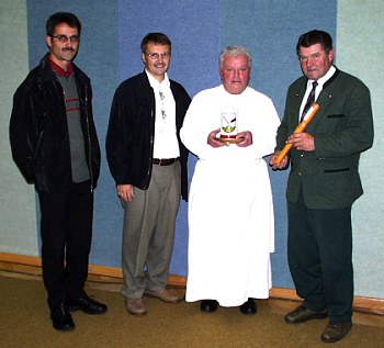Otto Pfeil (li. im Bild) und Kulturausschussobmann GV Heinrich Pfoser überreichten seitens der Gemeinde dem Jubilar ein kleines Ehrengeschenk sowie den ortsbekannten "Haptstecka" und