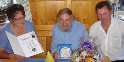 HASLACH: Die ersten zehn Jahre wohnte Herr Stifter im Gasthaus Wolkerstorfer. Seit dreißig Jahren verbringt er seine Urlaube im Gasthof Zum Alten Turm. Herr Stifter ist ein großer Fan der Wanderwege in der Ferienregion Böhmerwald. Besonders gerne geht er nach Maria Trost, dann den Kapellenweg zum Bahnhof Haslach und entlang der Mühl zurück nach Haslach. Während der Wanderung nimmt er sich oft die Zeit für einen Plausch mit den Bewohnern entlang des Weges. Er schätzt die Freundlichkeit und das Entgegenkommen der Einheimischen, darum kommt er immer wieder gerne. Marianne Kneidinger vom Tourismusverband Böhmerwald bedankte sich für die langjährige Treue mit einem Genusskorb aus der Region und überreichte ein Ehrenteller der Gemeinde Haslach.