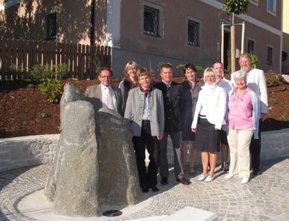 Neuer Ortsplatz mit Brunnen: Drei Granitsäulen mit Symbolkraft