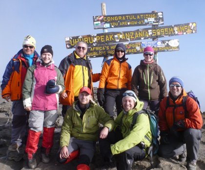 Die Reisegruppe mit dem Pfarrkirchner Gemeindearzt Dr. Alfred Fegerl (ganz links) am Uhuru-Peak, dem höchsten Gipfel im Kilimanjaro-Massiv.