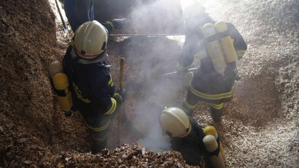 LACKEN: In einem Lagerraum für Hackschnitzel war durch einen Defekt in der Förderschnecke zur Heizung ein Glimmbrand entstanden, der sich durch leichte Rauchschwaden bemerkbar machte.