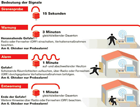 Österreich verfügt über ein flächendeckendes Warn-und Alarmsystem. Mit insgesamt 7000 Sirenen kann die Bevölkerung im Katastrophenfall gewarnt und alarmiert werden. Um Sie mit diesen Signalen vertraut zu machen und gleichzeitig die Funktion und Reichweite der Sirenen zu testen, wird seit 1998 einmal jährlich ein österreichweiter Zivilschutz-Probealarm durchgeführt.