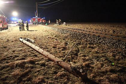 Nachdem er ein Stoppschild rammte ging die Fahrt durch eine Wiese und frontal auf einen Strommasten der Linzer Lokalbahn zu. Letzterer wurde vom Auto ebenso erfasst und komplett abgerissen. Nach einem Satz über die Schienen blieb der Pkw schließlich auf den Rädern in einem Feld stehen.