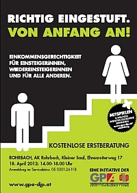 Zur persönlichen Information für Gewerkschaftsmitglieder bietet die GPA-djp OÖ im Bezirk Rohrbach, in der AK Rohrbach (kleiner Saal), Ehrenreiterweg 17, am 18. April 2012, 14.00-18.00 eine kostenlose Erstberatung an! Anmeldungen dafür bitte im GPA-djp Servicebüro unter der Nummer 050301-26118. Nähere Informationen zur Aktionswoche und zum Gewinnspiel finden Sie ab 16. April 2012 unter www.gpa-djp.at/einstufung.