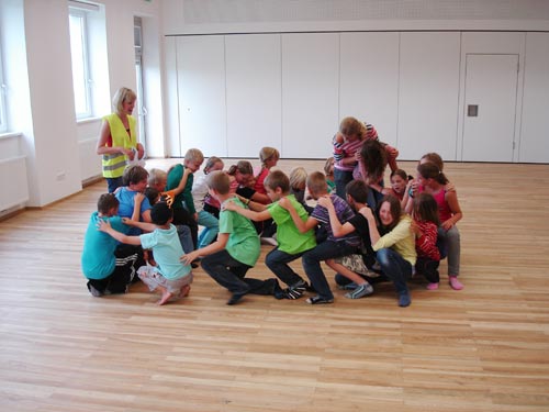 Da ein regnerischer Tag war, entschieden wir uns, das Programm nach drinnen zu verlegen. Mit 25 Kindern zwischen 6 und 14 Jahren starteten wir im Pfarrheim mit einer Spielgeschichte eine Reise nach New York. Dort hatten wir einen lustigen und abwechslungsreichen Aufenthalt, wir lernten das U-Bahnnetz kennen, fuhren mit dem Bus, mit dem Taxi, erfuhren die Lautstärke einer Millionenstadt, sangen in der Fußgängerzone und machten Bekanntschaft mit Taschendieben.