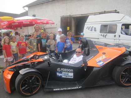 So fanden trotzdem 90 Motorräder den Weg nach Niederkappel und fanden ein besser werdendes Wetter vor. Aber wie im Bild zu sehen ist waren diesmal nicht nur Motorräder dabei, auch ein KTM X-Bow fuhr die Ausfahrt mit.