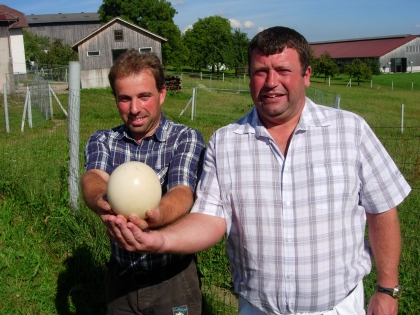 Gerald Beismann (li.) und Veranstaltungschef Eugen Rothberger zeigen ein Straußenei her