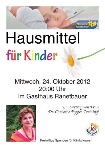 Die Gesunde Gemeinde Putzleinsdorf veranstaltet am Mittwoch, 24. Oktober 2012 einen Vortrag über Hausmittel für Kinder. Kinderärztin Dr. Christine Popper-Preining wird die Teilnehmer/innen über die vorbeugende und heilende Wirkung von Hausmitteln, wie z.B. Wasseranwendungen, Wickel und verschiedene Teemischungen informieren. Alle Interessierten sind herzlich eingeladen am Vortrag teilzunehmen!