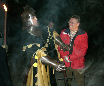 Projektleiter Matthias Koopmann und Hofkirchens Bürgermeister Martin Raab, Obmann des Erhaltungsvereins, hoffen auf zahlreiches Publikum. Zur Förderung der Erhaltungsmaßnahmen werden Erwachsenen vom bewaffneten Torwächter 2 Euro „Wegzoll“ abverlangt.
