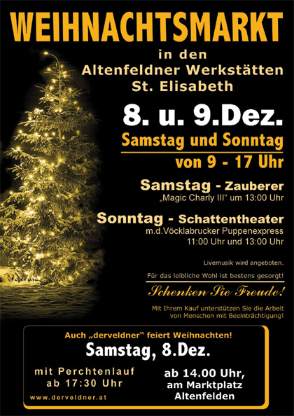 ALTENFELDEN: Bereits zur Tradition geworden ist der Weihnachtmarkt der Altenfeldner Werkstätten immer am zweiten Wochenende im Advent. Das Angebot ist vielfältig u. so können verschiedenen Holzprodukte, Töpferwaren, Schmuck, Teppiche, Dekoartikel, Flechtwaren u. noch vieles mehr erworben werden.