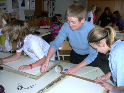 Genau diese Arbeitstechnik lernten die Schüler der 4A-Klasse bei diesem Projekt kennen. Einfache Bildgestaltungen aus der Erlebniswelt de Schüler wurden in Form von Glasfenstern dargestellt. Mit von Frau Balda selbst hergestellten Tuschen in den Grundfarben Rot, Gelb und Blau wurden Farbschichten auf Büttenpapier aufgetragen. Durch Überlagerung von verschiedenen Farbschichten entstanden die gewünschten Farbtöne. Spannende Bildwerke von intensiver Farbigkeit waren die Folge.