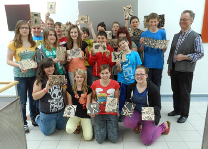 Schülerinnen und Schüler der 3B-Klasse aus Ulrichsberg arbeiteten einen Tag lang mit Christian Thanhäuser. Geschichten über Insekten, wie z. B. über den schwarzblauen Ölkäfer, der nur in der Zeit von April bis Juni zu sehen ist, bildeten den Ausgangspunkt für die kreative bildnerische Arbeit. Käfer, Schmetterlinge, Libellen und „Insekten-Erfindungen“ wurden zunächst gezeichnet, dann auf Holztafeln übertragen, geschnitten und im Handabzug, das heißt ohne Druckerpresse, gedruckt.