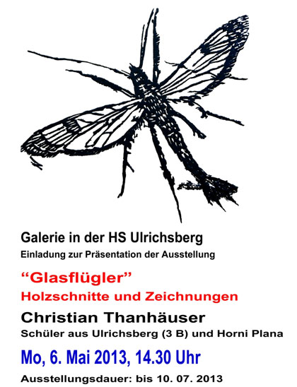 In einer gemeinsamen Ausstellung zunächst in der Galerie in der Hauptschule Ulrichsberg und im Herbst in Horni Plana werden die entstandenen Werke der Schülerinnen und Schüler gezeigt. Neben den Schülerarbeiten sind auch Holzschnitte und Zeichnungen von Christian Thanhäuser zu Adalbert Stifter und zu den „Glasflüglern“ zu sehen.