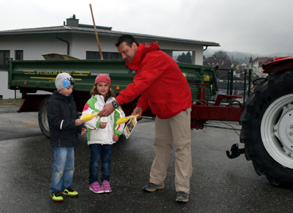 m Bild zu sehen: die kleine Anna und ihr Bruder Lorenz nehmen mit großer Freude die Sandschaufel von ÖAAB-Obmann Mag. Paul Danninger entgegen