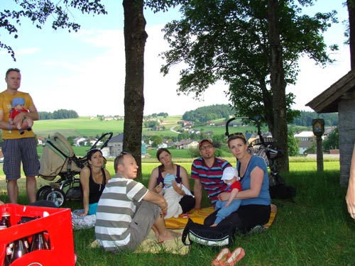 Nach wochenlangem Starkregen war der Wettergott der familienfreundlichen Gemeinde und dem SPIEGEL-Team wohlgesonnen und so machten sich insgesamt 9 Jungfamilien zu einer kleinen Wanderung auf. Gestartet wurde beim neu sanierten Pfarrheim, wo auch die Spielgruppe ihren „Hauptsitz“ hat. Von dort aus ging es mit einer kinderwagentauglichen Wanderung weiter zum PflanzenLabyrinth der Begegnung. Angekommen beim Labyrinth wurde zum gemütlichen Teil der Wanderung übergegangen: Die Picknickdecken wurden ausgebreitet und die Marktgemeinde Hofkirchen besserte die Picknickkörbe der teilnehmenden Familien noch mit gesunden Kleinigkeiten wie Obst und Müsliriegel auf. Für die durstigen Väter stand natürlich anlässlich des Vatertages auch eine kleine Überraschung bereit und sie konnten ihren Durst mit einem kühlen Bier löschen.