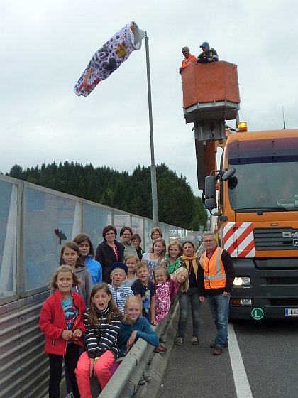 Im Rahmen dieser Ferien.Aktiv.Wochen wurde am Dienstag, dem 27.8.2013, bereits das 3. Mal, nach 2004 und 2009, der Windsack für die Mühltalbrücke in Neufelden (B127), welche von den Kindern bunt bemalt und gestaltet worden ist, übergeben bzw. aufgehängt. Damit leisten die Kinder einen aktiven Beitrag zur Verkehrssicherheit, denn der alte Windsack war wiederum kaputt und die Brücke daher einige Wochen ohne Windanzeige.