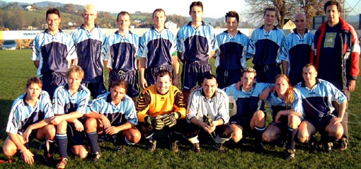 Die schlagkräftige Hofkirchner Kampfmannschaft nach dem Saisonfinale in Walding (stehend: Kehrer Joe, Fuchs Daniel, Lorenz Gerhard, Zeller Mario, Kehrer Johannes, Altenhofer Dieter, Schmidleitner Martin, Froschauer Christoph und Trainer Gernot Bachmeier; hockend: Draxler Thomas, Froschauer Alexander, Mairhofer Roland, Kraml Johann, Schwarzbauer August, Wundsam Stefan, Baumann Ingo und Bauer Wolfgang)