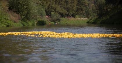 ALKOVEN: Außergewöhnlich sonnig und warm startete der Tag schlussendlich und ließ beruhigt auf eine tolle Veranstaltung schließen.In Zusammenarbeit mit den Alkovener Kinderfreunden, der Feuerwehr Alkoven sowie der Feuerwehr Polsing fand ab den späten Vormittagsstunden des 7. September in Höhe der Aschachbrücke in Gstocket das Quietschentenrennen statt. 3.000 Lose wurde dazu an den Mann und an die Frau gebracht. Für das heurige Jahr geht der Reinerlös der Veranstaltung an die beiden Alkovener Feuerwehren. Punkt 14 Uhr war es dann auch soweit. Die Gummi-Armee wurde in Höhe der Einfahrt ins Fkk-Gelände in eine Vorrichtung gekippt, nochmals ordentlich durchgemischt (jede Ente ist numeriert) und für den Start vorbereitet. Nach dem Start größerer "Vorschwimmer" ging es dann für 3.000 Quietschenten auf zur großen Reise bis in den Zielbereich bei der Aschachbrücke. In Dreiecksform wurde dort der Zieleinlauf gestaltet, wo sich rund 15 Minuten nach Start die ersten Schnellschwimmer durchsetzen und das Ziel erreichen konnten.