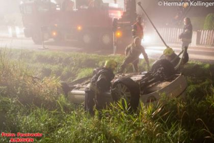 Das Auto kam am Dach liegend zum Stillstand. Beide Fahrzeuginsassen blieben unverletzt und konnten den Pkw aus eigener Kraft verlassen und die Feuerwehr rufen.Per Kran wurde der Pkw aus dem Bach gehoben und von der Unfallstelle entfernt. Nach rund einer Stunde war die Hilfeleistung abgeschlossen.