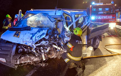 "Vor Ort fanden wir einen im Fahrerbereich schwer beschädigten Transporter auf der B 129 stehen", schildert Einsatzleiter und 1. Kommandant-Stellvertreter Markus Unter. "Dieser wurde bei der Kollision um 180° gedreht. Ein zweiter Transporter wurde - ebenfalls im Fahrerbereich schwer beschädigt - über eine Böschung in eine Wiese bzw. teils ein Feld geschleudert", so der Feuerwehrmann weiter. Die beiden Fahrzeuge waren zuvor zusammengestoßen. "Der Lenker des auf der Straße stehenden Fahrzeuges wurde im Beinbereich eingeklemmt, konnte jedoch durch den Einsatz eines Spreizer sehr rasch befreit und dem Rettungsdienst übergeben werden", so Unter weiter. Passanten und den Sanitätern gelang es noch vor dem Eintreffen der Feuerwehr, zwei weitere Verletzte aus den Fahrzeugen zu helfen bzw. diese zu versorgen.