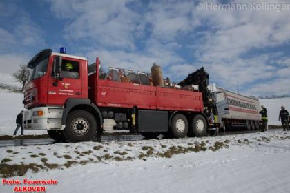 ALKOVEN: Dort war der Lenker eines unbeladenen Sattelschleppers auf der B 129 einem Pkw ausgewichen, der auf seine Seite ragte. Der Lkw kam dabei aufs Bankett, versank dort im Morast und lehnte an der Böschung. Da eigene Versuche, den Lkw per 5-Tonnen-Winde zu bergen, nicht erfolgreich waren, wurde das Kranfahrzeug der Feuerwehr Alkoven angefordert.