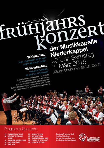 NIEDERKAPPEL: Die Musikkapelle Niederkappel lädt sehr herzlich zum Frühjahrskonzert ein. Es beginnt mit einem Sektempfang und geht über in die verschiedensten musikalischen Genüsse bis hin zum gemütlichen Ausklang bei einem Glas Wein, vom Weingut Weiss-Taschner! Ein unvergesslicher Abend ist garantiert!