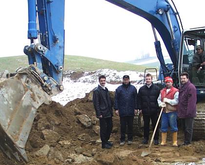 Mit den Baggerungen für den Anschluss des Betriebes Oberaigner wurde noch in diesen Tagen begonnen. Bürgermeister Otto Pfeil nahm im Beisein der ausführenden Baufirma Hehenberger aus Peilstein den Spatenstich vor; assistiert dabei von Baumeister Josef Lauß (Fa. Hehenberger) und Amtsleiter Karl Pfeil.