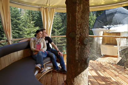 Alle, die es reizt, einmal unter dem Blätterdach des Böhmerwaldes zu schlafen, können dies ebenfalls ab 1. Mai in Schöneben in Mühlkreis tun. In 5 Metern Höhe schwebt das komfortable und von Ziviltechnikern geprüfte Baumbett. Konstruiert aus massivem Holz und Edelstahl, befestigt mit robusten und flexiblen Seilen, beschützt durch spezielle Gewebe wie einem eigens angefertigten Moskitonetz und ausgestattet mit Polstern und Decken aus Naturmaterialen, wie man sie sonst nur in den besten Hotel der Welt findet. „Sanft schaukelnd und tiefenentspannend, ein einzigartiges Erlebnis“ beschreiben die unzähligen Gäste ihre Nächte in den Baumwipfeln des Böhmerwalds.
