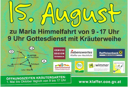 Am 15.August 2015 (Maria Himmelfahrt) findet in Klaffer von 09:00 bis 17:00 Uhr ein Kräuterkirtag mit Kunsthandwerksmarkt statt.