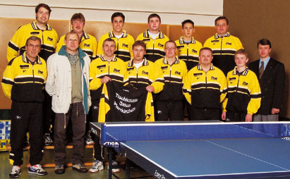Die Sponsoren Simon Rott von Sport-Spiel-Freizeit Rott in Untergriesbach und Josef Schwarzbauer von der Oberösterreichischen Versicherung gratulierten zum Doppelerfolg und überreichten den erfolgreichen Pfarrkirchner Tischtennisspielern neue Trainingsanzüge.