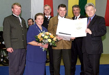 Festredner bei der feierlichen Überreichung im Turnsaal der Volksschule Heinrichsberg war Landeshauptmann Dr. Josef Pühringer. Eine große Gratulantenschar mit Landwirtschaftskammerpräsident Mag. ÖkonR. Hans Kletzmayr, Bauernbundlandesobmann LAbg. Hannes Herndl, Landesjägermeister ÖkonR. Hans Reisetbauer, Bezirkshauptfrau Dr. Wilbirg Mitterlehner-Winkler bis hin zu den Bürgermeistern der Nachbarsgemeinden stellten sich bei dem frischgebackenen Ökonomierat ein.