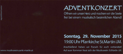 Adventkonzert Am Sonntag, 29. November 2015 findet um 19:00 Uhr das Adventkonzert des Musikverein St. Martin in der Pfarrkirche St. Martin statt.
