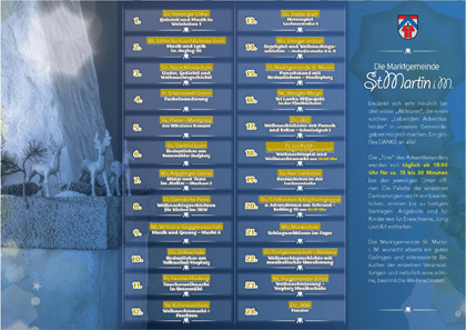 ST. MARTIN: Die „Tore“ des Adventkalenders werden sich täglich ab 18:00 Uhr für ca. 15 bis 30 Minuten bei den jeweiligen Orten öffnen.
