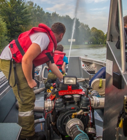 Im Anschluss daran erfolgte der Wechsel der Mannschaften der beiden aktiv teilnehmenden Wasserfahrzeuge (Arbeitsboot, Feuerwehrrettungsboot). Im Zuge der Fahrt stromaufwärts war das Arbeitsboot dann als fahrender Wasserwerfer unterwegs. In den wenigsten Fällen einsatzreal, aber das Arbeiten selbst erfüllte den gleichen Zweck sowie die entsprechende Übung.