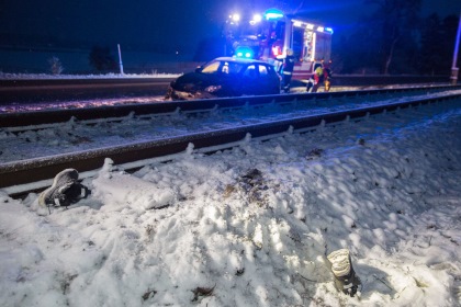 ALKOVEN: Als Einsatzort war die B 129 zwischen Straß und Emling angegeben worden. Den ersteintreffenden Kräften bot sich das Bild, das zuvor der Lenker eines Pkw auf der Bundesstraße ins Schleudern gekommen sein musste. Danach schlitterte der Pkw gegen die Seilverankerung eines Strommasten der dort vorbeiführenden Lokalbahn. Ein wegen des Winterräumdienstes zufällig vorbeikommender Mitarbeiter der Lokalbahn führte einen ersten Augenschein durch, Passanten alarmierten die Feuerwehr.Ohne Schuhe davon