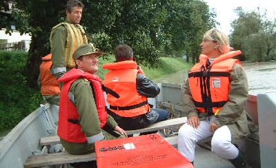 Bezirkshauptfrau Hofrat Dr. Mitterlehner und BFKDT OBR Erich Nößlböck besuchten die Hochwasseropfer in Kramesau. Am sonst stark befahrenen Radweg fuhr an diesem Tag das A-Boot der FF Niederranna