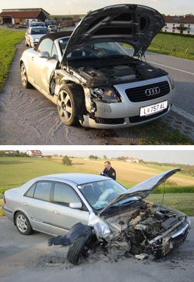 Die Lenkerin eines Fahrzeuges kam von Hofstetten und wollte an der Kreuzung bei Fam. Hagenauer Bruno, links Richtung St. Martin abbiegen. Zur gleichen Zeit fuhr ein Lenker von St. Martin Richtung Tankstelle Hartl. Am Kreuzungspunkt kam es zum Zusammenstoß, welcher so heftig war, dass beim ersten Fahrzeug das rechte Vorderrad weggerissen wurde. Zum Glück blieben die beteiligten Personen beinah unverletzt. Die Feuerwehr St. Martin wurde um ca. 18.10 alarmiert. Es wurde sofort, nach Erkennen der Lage die gesamte Landshaager Bezirksstraße von der Mundlkreuzung bis zur Bauhof-Kreuzung gesperrt. Außerdem wurde an der Unfallstelle das ausgelaufene Öl gebunden und die Fahrzeuge aus dem Gefahrenbereich entfernt.