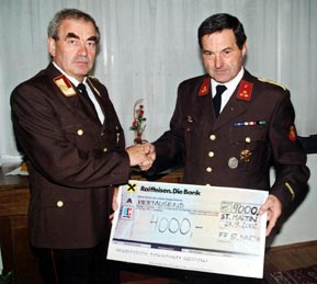ST.MARTIN: Einen großen Teil der Einnahmen des legendären Urwaldfestes der FF St. Martin übergab Kommandant Johann Fuchs dem Landes-Feuerwehrkommandanten Johann Huber für die Aktion "Kameraden helfen Kameraden".
