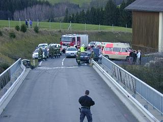 Die Feuerwehren Rohrbach und Oepping wurden um 15:30 Uhr zu einem Verkehrsunfall auf der B38 zwischen Rohrbach und Oepping mit vermutlich eingeklemmten Personen alarmiert. Tatsächlich war der Unfall aber auf der Brücke über die B38 am Zubringer Wandschaml. Ein PKW mit Jugendlichen war an die Leitplanke der Brücke geprallt, eingeklemmt war aber niemand. Die Feuerwehr Rohrbach machte den Verkehrsweg wieder frei. Die 4 Verletzten Personen wurden mit dem Notarzthubschrauber, dem Notarztwagen aus Rohrbach sowie mit Sanitätseinsatzwagen in die Krankenhäuser nach Linz und Rohrbach gebracht. Nach einer Stunde Einsatzzeit rückte die Feuerwehr Rohrbach mit 3 Fahrzeugen und 19 Mann wieder ein.