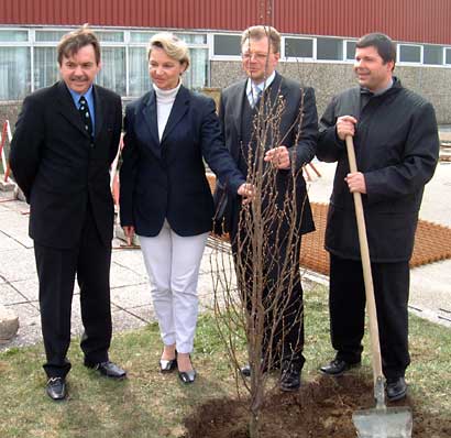 v.l.n.r.: Herr Sixt (Geschäftsführer Shoe & Shirt Production GmbH), Bezirkshauptfrau Dr.Mitterlehner, Mag.(FH) Netek(Geschäftsführer Firma Richter) und Bürgermeister Raab bei der Baumpflanzung.