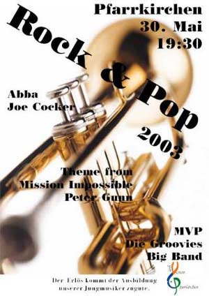PFARRKIRCHEN: Aufgrund des guten Besuches und positven Feedbacks im letzten Jahr wird das Rock- und Popkonzert der Musikkapelle Pfarrkirchen auch heuer wieder veranstaltet. Am 30. Mai 2003 ist es nun wieder so weit. Die Groovies, die Musikkapelle und die Big Band werden Ihr Können wieder unter Beweis stellen.