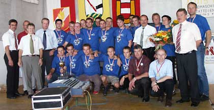 NEBELBERG. Im Rahmen des Jubiläumsfestes, 30-Jahre Union Nebelberg wurden die Fußballer der Sportunion Nebelberg offiziell für den Meistertitel der 2. Klasse Nordwest geehrt und die Meistermedaillen überreicht. Nationalrat Dr. Reinhold Mitterlehner in Vertretung von Sportreferent LH Dr. Josef Pühringer, OÖFB Präsidiumsmitglied Regierungsrat Günther Schnell und Gruppenobmann Königstorfer nahmen die Ehrung vor. NR Dr. Mitterlehner stellte sich natürlich mit einem handsignierten Matchball für die 1. Klasse als Gastgeschenk ein und überbrachte eine Blumenspende für die Torschützenkönigin der Frauenmannschaft – Michaela Wurm.