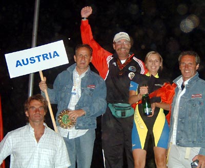 Heftiger Wind und über ein Meter hohe Wellen machten die EM zum Hasardspiel. „Ich wäre sicher nicht gestartet. Nicht für „nur“ eine Medaille“, schüttelte Teamchef Puritscher den Kopf. Aber Manfred Hintringer verkündete der Jury, die ebenfalls an Absage dachte: „Wir springen!“ Und wie er „flog“. Die 49,70 m im allerersten Satz ließen die Konkurrenz erschaudern, dann verbesserte er sich auf 58,10 m. Damit distanzierte er alle Rivalen um über fünf Meter! Noch beeindruckender: Manfreds „Gold-Flug“ war erst sein 18. Saisonsprung. „Ich musste ja Kräfte sparen, hatte nach meiner Sprunggelenks-Operation im Februar immer wieder große Schmerzen“, so der 39-jährige, der sich mit Trockentraining und Standweitsprüngen fit hielt. „Wichtig ist die Technik des Anschleuderns. Das hab ich Hunderte Mal am Baggersee getestet“, so Hintringer. Ein herzlicher Glückwunsch an den Hofkirchner Modellathleten, der nächstes Jahr bei der Weltmeisterschaft, die möglicherweise in Orlando, USA, stattfinden wird, unbedingt nocheinmal Gold holen will!